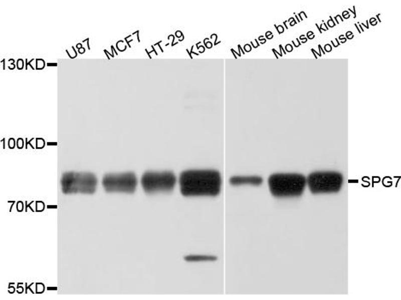 Der Kaninchen Polyklonal anti-SPG7 Antikörper wird verwendet zum Nachweis von SPG7 in Proben von Human, Maus und Ratte. Er wurde validiert für WB.