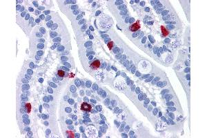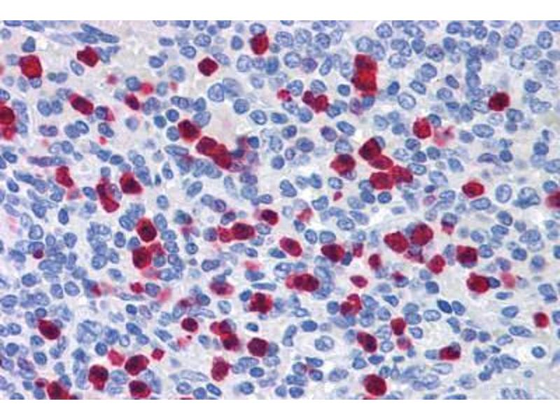 Usage: Peptide ELISA: antibody detection limit dilution 1:16000. Western Blot: Preliminary experiments gave an approx 60kD band in Human Lymph Node and Testis lysates after 0.03 μg/mL antibody staining. Please note that currently we cannot find an explanation in the literature for the band we observe given the calculated size of 185kD according to NP_055450.1 and of 196kD according to NP_852118.1. The 60kD band was successfully blocked by incubation with the immunizing peptide. We would appreciate any feedback from people in the field - have any results been reported with other antibodies / lysates? Have any further splice variants / modified forms been reported? -
