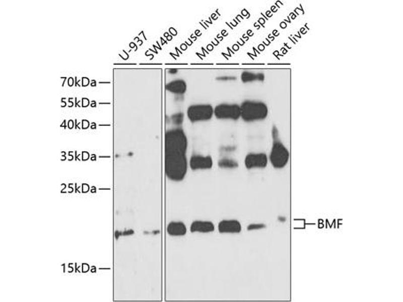 The protein encoded by this gene belongs to the BCL2 protein family. BCL2 family members form hetero- or homodimers and act as anti- or pro-apoptotic regulators that are involved in a wide variety of cellular activities. This protein contains a single BCL2 homology domain 3 (BH3), and has been shown to bind BCL2 proteins and function as an apoptotic activator. This protein is found to be sequestered to myosin V motors by its association with dynein light chain 2, which may be important for sensing intracellular damage and triggering apoptosis. Alternatively spliced transcript variants encoding different isoforms have been identified.,BMF,Signal Transduction,Cell Biology & Developmental Biology,Apoptosis,Mitochondrial Control of Apoptosis,Cytoskeleton,Motor Proteins,BMF