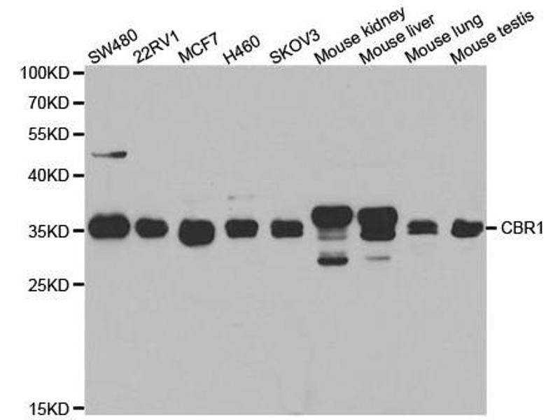 - The protein encoded by this gene belongs to the short-chain dehydrogenases/reductases (SDR) family, which function as NADPH-dependent oxidoreductases having wide specificity for carbonyl compounds, such as quinones, prostaglandins, and various xenobiotics. Alternatively spliced transcript variants have been found for this gene.,CBR1,CBR,SDR21C1,hCBR1,Cancer,Signal Transduction,Cell Biology & Developmental Biology,Endocrine & Metabolism,CBR1