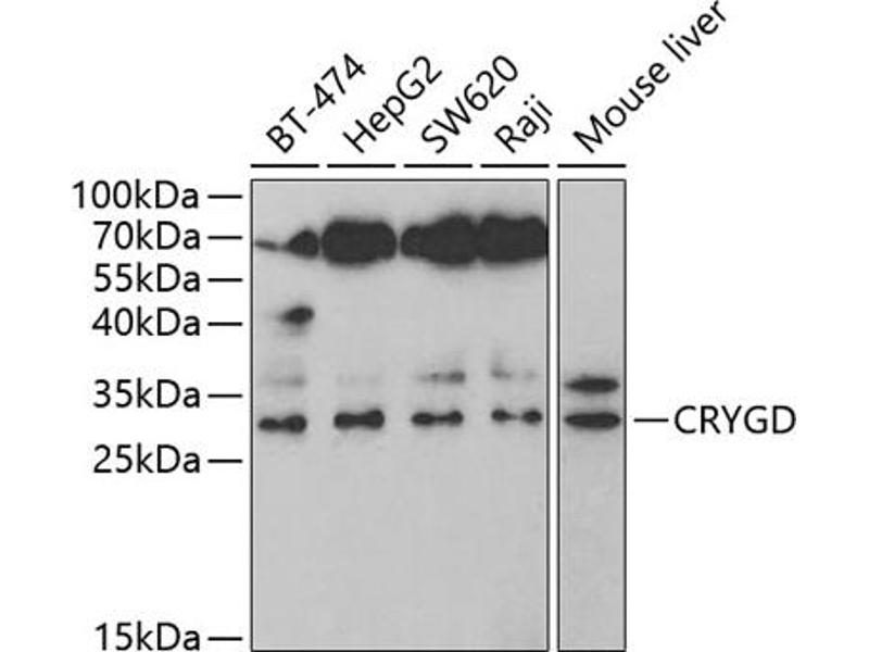 Crystallins are separated into two classes: taxon-specific, or enzyme, and ubiquitous. The latter class constitutes the major proteins of vertebrate eye lens and maintains the transparency and refractive index of the lens. Since lens central fiber cells lose their nuclei during development, these crystallins are made and then retained throughout life, making them extremely stable proteins. Mammalian lens crystallins are divided into alpha, beta, and gamma families, beta and gamma crystallins are also considered as a superfamily. Alpha and beta families are further divided into acidic and basic groups. Seven protein regions exist in crystallins: four homologous motifs, a connecting peptide, and N- and C-terminal extensions. Gamma-crystallins are a homogeneous group of highly symmetrical, monomeric proteins typically lacking connecting peptides and terminal extensions. They are differentially regulated after early development. Four gamma-crystallin genes (gamma-A through gamma-D) and three pseudogenes (gamma-E, gamma-F, gamma-G) are tandemly organized in a genomic segment as a gene cluster. Whether due to aging or mutations in specific genes, gamma-crystallins have been involved in cataract formation.,CRYGD,CACA,CCA3,CCP,CRYG4,CTRCT4,PCC,cry-g-D,Neuroscience,CRYGD
