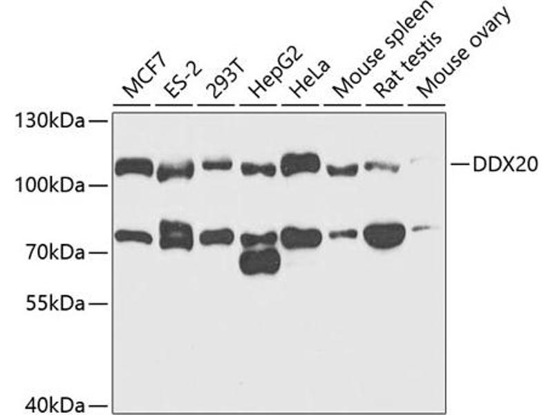 - DEAD box proteins, characterized by the conserved motif Asp-Glu-Ala-Asp (DEAD), are putative RNA helicases. They are implicated in a number of cellular processes involving alteration of RNA secondary structure such as translation initiation, nuclear and mitochondrial splicing, and ribosome and spliceosome assembly. Based on their distribution patterns, some members of this family are believed to be involved in embryogenesis, spermatogenesis, and cellular growth and division. This gene encodes a DEAD box protein, which has an ATPase activity and is a component of the survival of motor neurons (SMN) complex. This protein interacts directly with SMN, the spinal muscular atrophy gene product, and may play a catalytic role in the function of the SMN complex on RNPs.,DDX20,DP103,GEMIN3,Epigenetics & Nuclear Signaling,Signal Transduction,Cell Biology & Developmental Biology,Apoptosis,Neuroscience,DDX20
