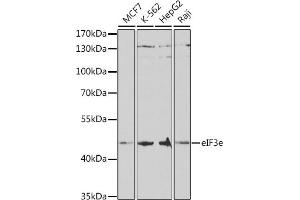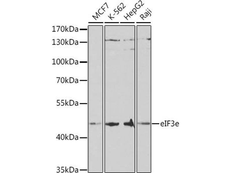 - Component of the eukaryotic translation initiation factor 3 (eIF-3 complex, which is required for several steps in the initiation of protein synthesis. The eIF-3 complex associates with the 40S ribosome and facilitates the recruitment of eIF-1, eIF-1A, eIF-2:GTP:methionyl-tRNAi and eIF-5 to form the 43S pre-initiation complex (43S PIC. The eIF-3 complex stimulates mRNA recruitment to the 43S PIC and scanning of the mRNA for AUG recognition. The eIF-3 complex is also required for disassembly and recycling of post-termination ribosomal complexes and subsequently prevents premature joining of the 40S and 60S ribosomal subunits prior to initiation. The eIF-3 complex specifically targets and initiates translation of a subset of mRNAs involved in cell proliferation, including cell cycling, differentiation and apoptosis, and uses different modes of RNA stem-loop binding to exert either translational activation or repression. Required for nonsense-mediated mRNA decay (NMD, may act in conjunction with UPF2 to divert mRNAs from translation to the NMD pathway. May interact with MCM7 and EPAS1 and regulate the proteasome-mediated degradation of these proteins.,EIF3E,EIF3-P48,EIF3S6,INT6,eIF3-p46,Epigenetics & Nuclear Signaling,EIF3E