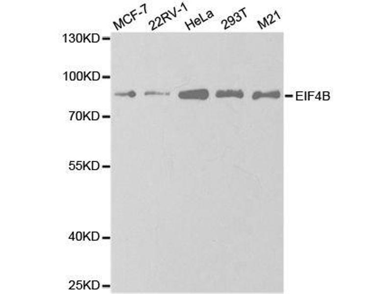 Required for the binding of mRNA to ribosomes. Functions in close association with EIF4-F and EIF4-A. Binds near the 5'-terminal cap of mRNA in presence of EIF-4F and ATP. Promotes the ATPase activity and the ATP-dependent RNA unwinding activity of both EIF4-A and EIF4-F.,EIF4B,EIF-4B,PRO1843,Epigenetics & Nuclear Signaling,RNA Binding,Translation Control,Regulation of eIF4 and p70 S6 Kinase,Signal Transduction,MAPK-Erk Signaling Pathway,EIF4B