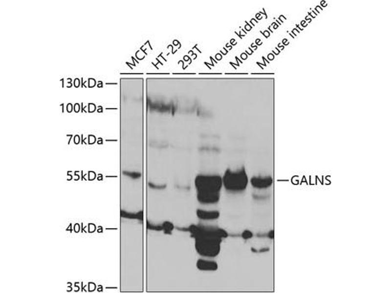 - This gene encodes N-acetylgalactosamine-6-sulfatase which is a lysosomal exohydrolase required for the degradation of the glycosaminoglycans, keratan sulfate, and chondroitin 6-sulfate. Sequence alterations including point, missense and nonsense mutations, as well as those that affect splicing, result in a deficiency of this enzyme. Deficiencies of this enzyme lead to Morquio A syndrome, a lysosomal storage disorder.,GALNS,GALNAC6S,GAS,GalN6S,MPS4A,Signal Transduction,Cell Biology & Developmental Biology,Cytoskeleton,Extracellular Matrix,Ubiquitin,GALNS