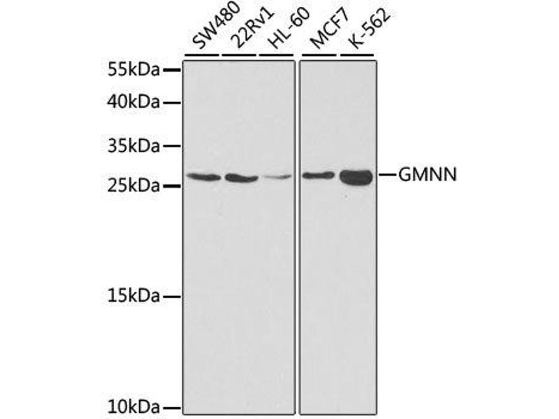 - This gene encodes a protein that plays a critical role in cell cycle regulation. The encoded protein inhibits DNA replication by binding to DNA replication factor Cdt1, preventing the incorporation of minichromosome maintenance proteins into the pre-replication complex. The encoded protein is expressed during the S and G2 phases of the cell cycle and is degraded by the anaphase-promoting complex during the metaphase-anaphase transition. Increased expression of this gene may play a role in several malignancies including colon, rectal and breast cancer. Alternatively spliced transcript variants have been observed for this gene, and two pseudogenes of this gene are located on the short arm of chromosome 16.,GMNN,Gem,MGORS6,geminin,Epigenetics & Nuclear Signaling,Cancer,Cell Biology & Developmental Biology,Cell Cycle,GMNN