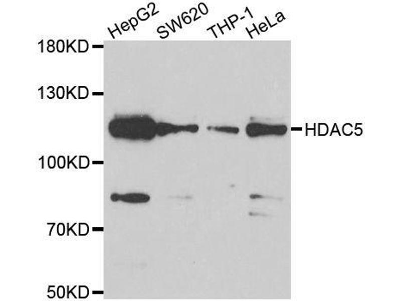 - Histones play a critical role in transcriptional regulation, cell cycle progression, and developmental events. Histone acetylation/deacetylation alters chromosome structure and affects transcription factor access to DNA. The protein encoded by this gene belongs to the class II histone deacetylase/acuc/apha family. It possesses histone deacetylase activity and represses transcription when tethered to a promoter. It coimmunoprecipitates only with HDAC3 family member and might form multicomplex proteins. It also interacts with myocyte enhancer factor-2 (MEF2) proteins, resulting in repression of MEF2-dependent genes. This gene is thought to be associated with colon cancer. Two transcript variants encoding different isoforms have been found for this gene.,HDAC5,HD5,NY-CO-9,Epigenetics & Nuclear Signaling,Nuclear Receptor Signaling,Signal Transduction,Cell Biology & Developmental Biology,Cell Cycle,G1/S Checkpoint,Notch Signaling Pathway,Wnt/β-Catenin Signaling Pathway,Immunology & Inflammation,NF-kB Signaling Pathway,Stem Cells,Cardiovascular,Heart,Hypertrophy,HDAC5