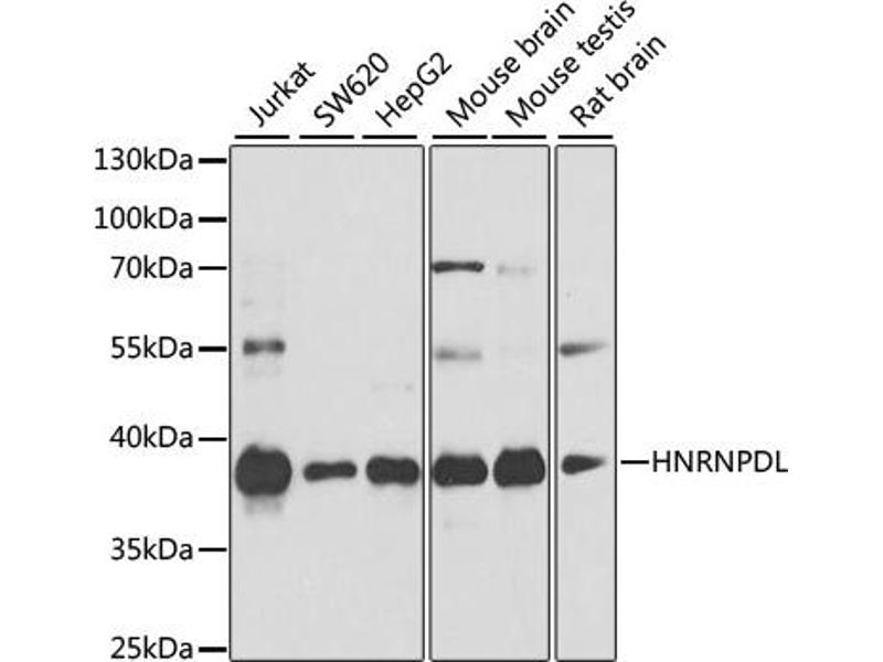 - This gene belongs to the subfamily of ubiquitously expressed heterogeneous nuclear ribonucleoproteins (hnRNPs). The hnRNPs are RNA binding proteins and they complex with heterogeneous nuclear RNA (hnRNA). These proteins are associated with pre-mRNAs in the nucleus and appear to influence pre-mRNA processing and other aspects of mRNA metabolism and transport. While all of the hnRNPs are present in the nucleus, some seem to shuttle between the nucleus and the cytoplasm. The hnRNP proteins have distinct nucleic acid binding properties. The protein encoded by this gene has two RRM domains that bind to RNAs. Three alternatively spliced transcript variants have been described for this gene. One of the variants is probably not translated because the transcript is a candidate for nonsense-mediated mRNA decay. The protein isoforms encoded by this gene are similar to its family member HNRPD.,HNRNPDL,HNRNP,HNRPDL,JKTBP,JKTBP2,LGMD1G,laAUF1,Epigenetics & Nuclear Signaling,RNA Binding,HNRNPDL