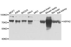 - Molecular chaperone implicated in a wide variety of cellular processes, including protection of the proteome from stress, folding and transport of newly synthesized polypeptides, activation of proteolysis of misfolded proteins and the formation and dissociation of protein complexes. Plays a pivotal role in the protein quality control system, ensuring the correct folding of proteins, the re-folding of misfolded proteins and controlling the targeting of proteins for subsequent degradation. This is achieved through cycles of ATP binding, ATP hydrolysis and ADP release, mediated by co-chaperones. The affinity for polypeptides is regulated by its nucleotide bound state. In the ATP-bound form, it has a low affinity for substrate proteins. However, upon hydrolysis of the ATP to ADP, it undergoes a conformational change that increases its affinity for substrate proteins. It goes through repeated cycles of ATP hydrolysis and nucleotide exchange, which permits cycles of substrate binding and release. Plays a role in spermatogenesis. In association with SHCBP1L may participate in the maintenance of spindle integrity during meiosis in male germ cells (By similarity.,HSPA2,HSP70-2,HSP70-3,Cancer,Tumor biomarkers,Signal Transduction,Endocrine & Metabolism,Mitochondrial metabolism,HSPA2