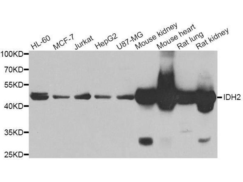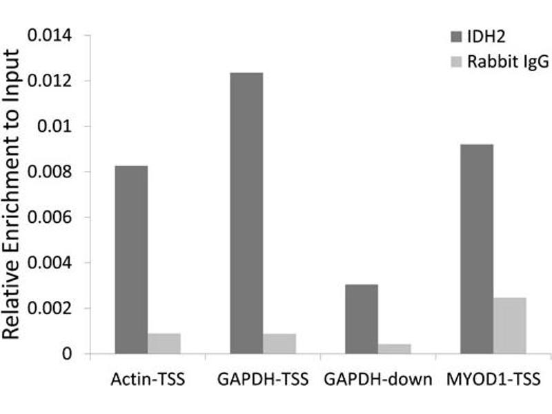 - Isocitrate dehydrogenases catalyze the oxidative decarboxylation of isocitrate to 2-oxoglutarate. These enzymes belong to two distinct subclasses, one of which utilizes NAD(+) as the electron acceptor and the other NADP(+). Five isocitrate dehydrogenases have been reported: three NAD(+)-dependent isocitrate dehydrogenases, which localize to the mitochondrial matrix, and two NADP(+)-dependent isocitrate dehydrogenases, one of which is mitochondrial and the other predominantly cytosolic. Each NADP(+)-dependent isozyme is a homodimer. The protein encoded by this gene is the NADP(+)-dependent isocitrate dehydrogenase found in the mitochondria. It plays a role in intermediary metabolism and energy production. This protein may tightly associate or interact with the pyruvate dehydrogenase complex. Alternative splicing results in multiple transcript variants.,IDH2,D2HGA2,ICD-M,IDH,IDHM,IDP,IDPM,mNADP-IDH,Epigenetics & Nuclear Signaling,Cancer,Signal Transduction,Endocrine & Metabolism,Mitochondrial metabolism,Mitochondrial markers,IDH2