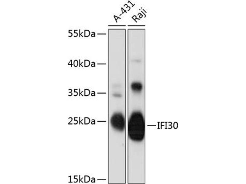 Der Kaninchen Polyklonal anti-IFI30 Antikörper (ABIN6142166) detektiert spezifisch IFI30 in WB.