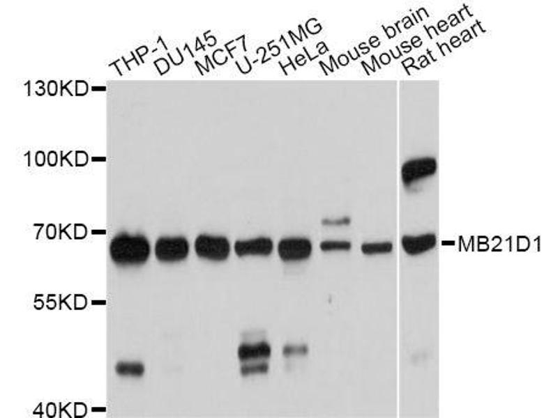 Nucleotidyltransferase that catalyzes the formation of cyclic GMP-AMP (cGAMP) from ATP and GTP and plays a key role in innate immunity (PubMed:23258413, PubMed:23707061, PubMed:23722159, PubMed:24077100, PubMed:25131990, PubMed:29976794, PubMed:30799039). Catalysis involves both the formation of a 2',5' phosphodiester linkage at the GpA step and the formation of a 3',5' phosphodiester linkage at the ApG step, producing c[G(2',5')pA(3',5')p] (PubMed:28363908, PubMed:28214358). Acts as a key cytosolic DNA sensor, the presence of double-stranded DNA (dsDNA) in the cytoplasm being a danger signal that triggers the immune responses (PubMed:28363908). Binds cytosolic DNA directly, leading to activation and synthesis of cGAMP, a second messenger that binds to and activates TMEM173/STING, thereby triggering type-I interferon production (PubMed:28363908, PubMed:28314590). Preferentially recognizes and binds curved long DNAs (PubMed:30007416). In contrast to other mammals, human CGAS displays species-specific mechanisms of DNA recognition and produces less cyclic GMP-AMP (cGAMP), allowing a more fine-tuned response to pathogens (PubMed:30007416). Has antiviral activity by sensing the presence of dsDNA from DNA viruses in the cytoplasm (PubMed:28363908). Also acts as an innate immune sensor of infection by retroviruses, such as HIV-1, by detecting the presence of reverse-transcribed DNA in the cytosol (PubMed:23929945). Detection of retroviral reverse-transcribed DNA in the cytosol may be indirect and be mediated via interaction with PQBP1, which directly binds reverse-transcribed retroviral DNA (PubMed:26046437). Also detects the presence of DNA from bacteria, such as M.tuberculosis (PubMed:26048138). cGAMP can be transferred from producing cells to neighboring cells through gap junctions, leading to promote TMEM173/STING activation and convey immune response to connecting cells (PubMed:24077100).,MB21D1,C6orf150,cGAS,h-cGAS,CGAS,Cell Biology & Developmental Biology,CGAS