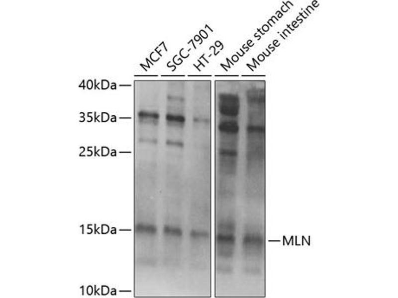 This gene encodes a small peptide hormone that is secreted by cells of the small intestine to regulate gastrointestinal contractions and motility. Proteolytic processing of the secreted protein produces the mature peptide and a byproduct referred to as motilin-associated peptide (MAP). Three transcript variants encoding different preproprotein isoforms but the same mature peptide have been found for this gene.,MLN,motilin,Signal Transduction,G protein signaling,G-Protein-Coupled Receptors(GPCR),Cell Biology & Developmental Biology,Growth factor,MLN