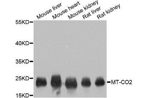 - Component of the cytochrome c oxidase, the last enzyme in the mitochondrial electron transport chain which drives oxidative phosphorylation. The respiratory chain contains 3 multisubunit complexes succinate dehydrogenase (complex II, CII, ubiquinol-cytochrome c oxidoreductase (cytochrome b-c1 complex, complex III, CIII and cytochrome c oxidase (complex IV, CIV, that cooperate to transfer electrons derived from NADH and succinate to molecular oxygen, creating an electrochemical gradient over the inner membrane that drives transmembrane transport and the ATP synthase. Cytochrome c oxidase is the component of the respiratory chain that catalyzes the reduction of oxygen to water. Electrons originating from reduced cytochrome c in the intermembrane space (IMS are transferred via the dinuclear copper A center (CU(A of subunit 2 and heme A of subunit 1 to the active site in subunit 1, a binuclear center (BNC formed by heme A3 and copper B (CU(B. The BNC reduces molecular oxygen to 2 water molecules using 4 electrons from cytochrome c in the IMS and 4 protons from the mitochondrial matrix.,MT-CO2,COII,MTCO2,COX2,Cancer,Signal Transduction,Endocrine & Metabolism,Mitochondrial metabolism,Cytochromes,Mitochondrial markers,Oxidative phosphorylation,Neuroscience,Neurodegenerative Diseases,MT-CO2