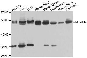 - A synthetic peptide corresponding to a sequence within amino acids 350-450 of mouse MT-ND4 (NP_904337.1).
