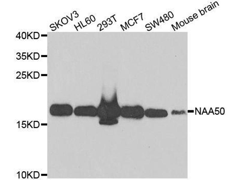- N-alpha-acetyltransferase that acetylates the N-terminus of proteins that retain their initiating methionine. Has a broad substrate specificity: able to acetylate the initiator methionine of most peptides, except for those with a proline in second position. Also displays N-epsilon-acetyltransferase activity by mediating acetylation of the side chain of specific lysines on proteins. Autoacetylates in vivo. The relevance of N-epsilon-acetyltransferase activity is however unclear: able to acetylate H4 in vitro, but this result has not been confirmed in vivo. Component of N-alpha-acetyltransferase complexes containing NAA10 and NAA15, which has N-alpha-acetyltransferase activity. Does not influence the acetyltransferase activity of NAA10. However, it negatively regulates the N-alpha-acetyltransferase activity of the N-terminal acetyltransferase A complex (also called the NatA complex. The multiprotein complexes probably constitute the major contributor for N-terminal acetylation at the ribosome exit tunnel, with NAA10 acetylating all amino termini that are devoid of methionine and NAA50 acetylating other peptides. Required for sister chromatid cohesion during mitosis by promoting binding of CDCA5/sororin to cohesin: may act by counteracting the function of NAA10.,NAA50,MAK3,NAT13,NAT13P,NAT5,NAT5P,SAN,Epigenetics & Nuclear Signaling,Cell Biology & Developmental Biology,NAA50