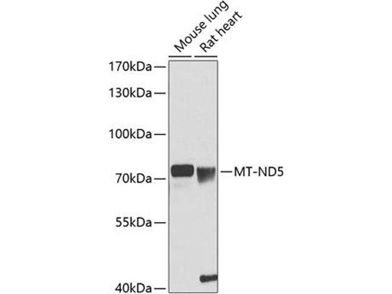 Core subunit of the mitochondrial membrane respiratory chain NADH dehydrogenase (Complex I which catalyzes electron transfer from NADH through the respiratory chain, using ubiquinone as an electron acceptor. Essential for the catalytic activity and assembly of complex I.,MT-ND5,MTND5,ND5,Cancer,Signal Transduction,Endocrine & Metabolism,Mitochondrial metabolism,Mitochondrial markers,Neuroscience,Neurodegenerative Diseases,MT-ND5