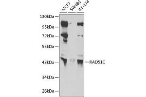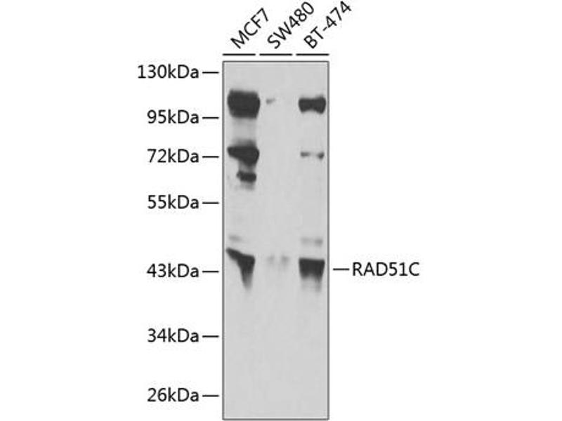 This gene is a member of the RAD51 family. RAD51 family members are highly similar to bacterial RecA and Saccharomyces cerevisiae Rad51 and are known to be involved in the homologous recombination and repair of DNA. This protein can interact with other RAD51 paralogs and is reported to be important for Holliday junction resolution. Mutations in this gene are associated with Fanconi anemia-like syndrome. This gene is one of four localized to a region of chromosome 17q23 where amplification occurs frequently in breast tumors. Overexpression of the four genes during amplification has been observed and suggests a possible role in tumor progression. Alternative splicing results in multiple transcript variants.,RAD51C,BROVCA3,FANCO,R51H3,RAD51L2,Epigenetics & Nuclear Signaling,DNA Damage & Repair,RAD51C
