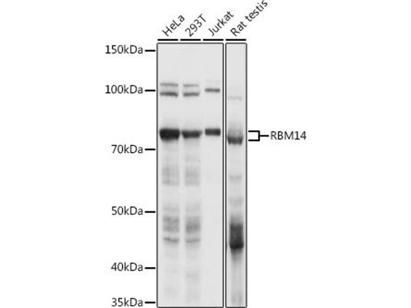 This gene encodes a ribonucleoprotein that functions as a general nuclear coactivator, and an RNA splicing modulator. This protein contains two RNA recognition motifs (RRM) at the N-terminus, and multiple hexapeptide repeat domain at the C-terminus that interacts with thyroid hormone receptor-binding protein (TRBP), and is required for transcription activation. Alternatively spliced transcript variants encoding different isoforms (with opposing effects on transcription) have been described for this gene.,RBM14,COAA,PSP2,SIP,SYTIP1,TMEM137,Epigenetics & Nuclear Signaling,RNA Binding,RBM14
