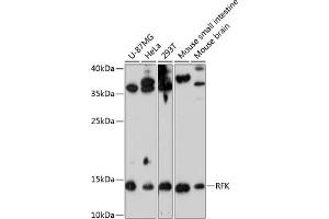 Riboflavin kinase (RFK, EC 2.7.1.26) is an essential enzyme that catalyzes the phosphorylation of riboflavin (vitamin B2) to form flavin mononucleotide (FMN), an obligatory step in vitamin B2 utilization and flavin cofactor synthesis (Karthikeyan et al., 2003 [PubMed 12623014]).[supplied by OMIM, Nov 2009],RFK,RIFK,Signal Transduction,Endocrine & Metabolism,RFK
