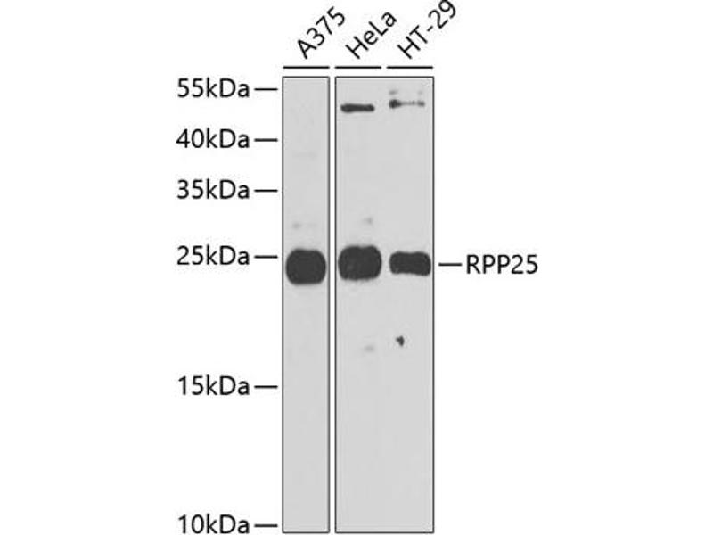 - Component of ribonuclease P, a ribonucleoprotein complex that generates mature tRNA molecules by cleaving their 5'-ends. Also a component of the MRP ribonuclease complex, which cleaves pre-rRNA sequences.,RPP25,Epigenetics & Nuclear Signaling,RNA Binding,Endocrine & Metabolism,Mitochondrial metabolism,RPP25