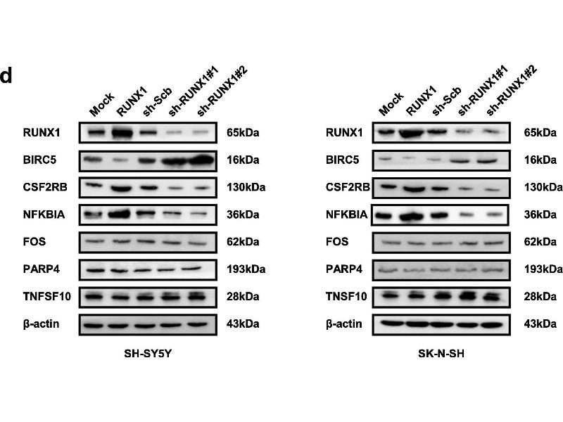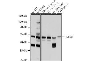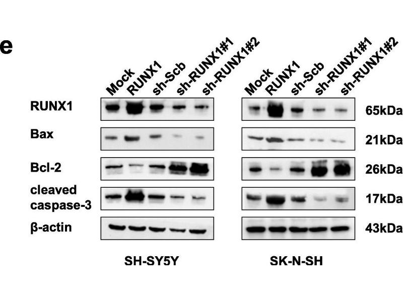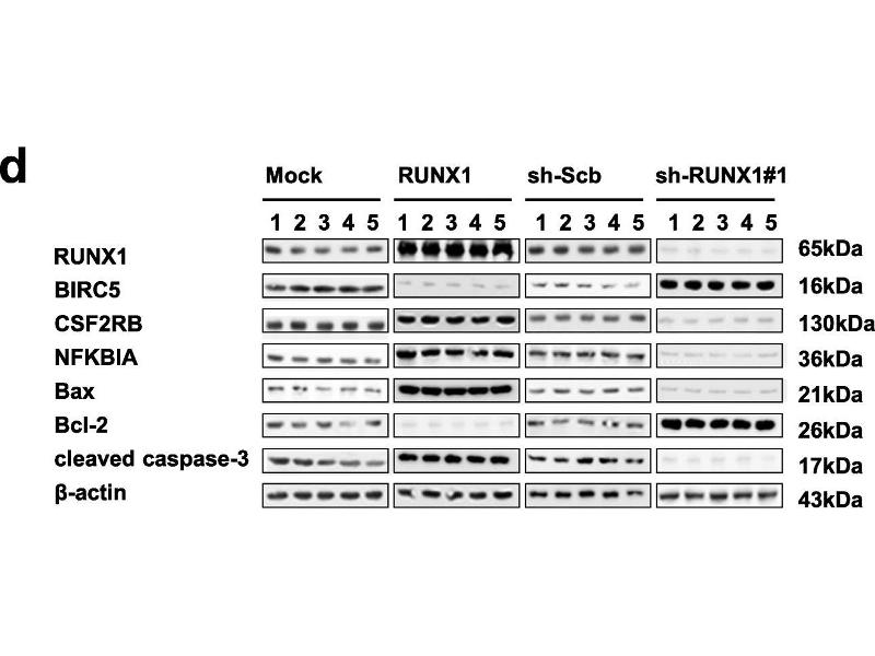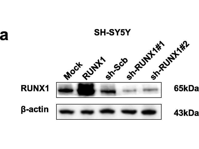 Core binding factor (CBF) is a heterodimeric transcription factor that binds to the core element of many enhancers and promoters. The protein encoded by this gene represents the alpha subunit of CBF and is thought to be involved in the development of normal hematopoiesis. Chromosomal translocations involving this gene are well-documented and have been associated with several types of leukemia. Three transcript variants encoding different isoforms have been found for this gene.,RUNX1,AML1,AML1-EVI-1,AMLCR1,CBF2alpha,CBFA2,EVI-1,PEBP2aB,PEBP2alpha,Epigenetics & Nuclear Signaling,Transcription Factors,Cancer,Cell Biology & Developmental Biology,Hippo Signaling Pathway,Neuroscience,Stem Cells,Hematopoietic Progenitors,Cardiovascular,Angiogenesis,RUNX1