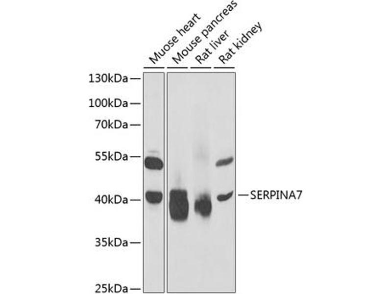 There are three proteins including thyroxine-binding globulin (TBG), transthyretin and albumin responsible for carrying the thyroid hormones thyroxine (T4) and 3,5,3'-triiodothyronine (T3) in the bloodstream. This gene encodes the major thyroid hormone transport protein, TBG, in serum. It belongs to the serpin family in genomics, but the protein has no inhibitory function like many other members of the serpin family. Mutations in this gene result in TGB deficiency, which has been classified as partial deficiency, complete deficiency, and excess, based on the level of serum TBG. Alternatively spliced transcript variants encoding different isoforms have been found, but the full-length nature of these variants has not been determined.,SERPINA7,TBG,TBGQTL,Signal Transduction,Cell Biology & Developmental Biology,Growth factor,SERPINA7