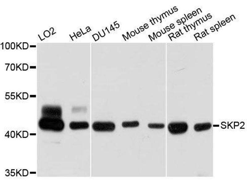 This gene encodes a member of the F-box protein family which is characterized by an approximately 40 amino acid motif, the F-box. The F-box proteins constitute one of the four subunits of ubiquitin protein ligase complex called SCFs (SKP1-cullin-F-box), which function in phosphorylation-dependent ubiquitination. The F-box proteins are divided into 3 classes: Fbws containing WD-40 domains, Fbls containing leucine-rich repeats, and Fbxs containing either different protein-protein interaction modules or no recognizable motifs. The protein encoded by this gene belongs to the Fbls class, in addition to an F-box, this protein contains 10 tandem leucine-rich repeats. This protein is an essential element of the cyclin A-CDK2 S-phase kinase. It specifically recognizes phosphorylated cyclin-dependent kinase inhibitor 1B (CDKN1B, also referred to as p27 or KIP1) predominantly in S phase and interacts with S-phase kinase-associated protein 1 (SKP1 or p19). In addition, this gene is established as a protooncogene causally involved in the pathogenesis of lymphomas. Alternative splicing of this gene generates three transcript variants encoding different isoforms.,SKP2,FBL1,FBXL1,FLB1,p45,Signal Transduction,Kinase,Cell Biology & Developmental Biology,Apoptosis,Ubiquitin,Ubiquitin-Proteasome Signaling Pathway,SKP2
