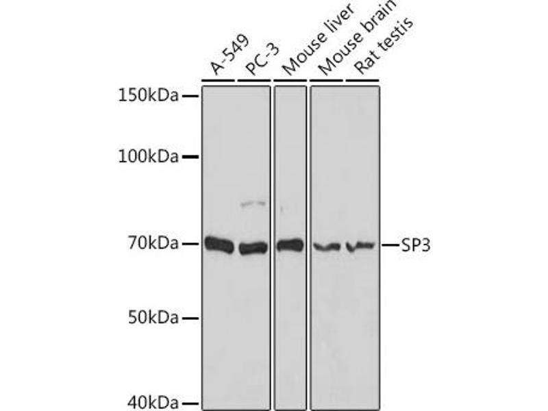 - This gene belongs to a family of Sp1 related genes that encode transcription factors that regulate transcription by binding to consensus GC- and GT-box regulatory elements in target genes. This protein contains a zinc finger DNA-binding domain and several transactivation domains, and has been reported to function as a bifunctional transcription factor that either stimulates or represses the transcription of numerous genes. Transcript variants encoding different isoforms have been described for this gene, and one has been reported to initiate translation from a non-AUG (AUA) start codon. Additional isoforms, resulting from the use of alternate downstream translation initiation sites, have also been noted. A related pseudogene has been identified on chromosome 13.,SP3,SPR2,Epigenetics & Nuclear Signaling,Transcription Factors,SP3