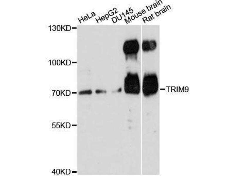 Der Kaninchen Polyklonal anti-TRIM9 Antikörper (ABIN6149538) detektiert spezifisch TRIM9 in WB.