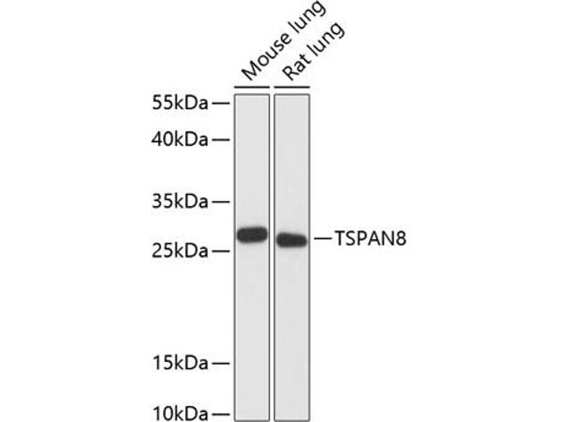 The protein encoded by this gene is a member of the transmembrane 4 superfamily, also known as the tetraspanin family. Most of these members are cell-surface proteins that are characterized by the presence of four hydrophobic domains. The proteins mediate signal transduction events that play a role in the regulation of cell development, activation, growth and motility. This encoded protein is a cell surface glycoprotein that is known to complex with integrins. This gene is expressed in different carcinomas. The use of alternate polyadenylation sites has been found for this gene.,TSPAN8,CO-029,TM4SF3,Cancer,Signal Transduction,TSPAN8