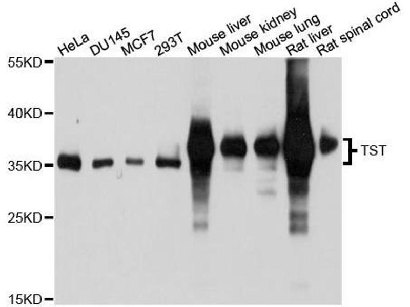 - This is one of two neighboring genes encoding similar proteins that each contain two rhodanese domains. The encoded protein is localized to the mitochondria and catalyzes the conversion of thiosulfate and cyanide to thiocyanate and sulfite. In addition, the protein interacts with 5S ribosomal RNA and facilitates its import into the mitochondria. Alternative splicing results in multiple transcript variants.,TST,RDS,Cancer,Signal Transduction,Endocrine & Metabolism,Mitochondrial metabolism,Mitochondrial markers,Drug metabolism,TST
