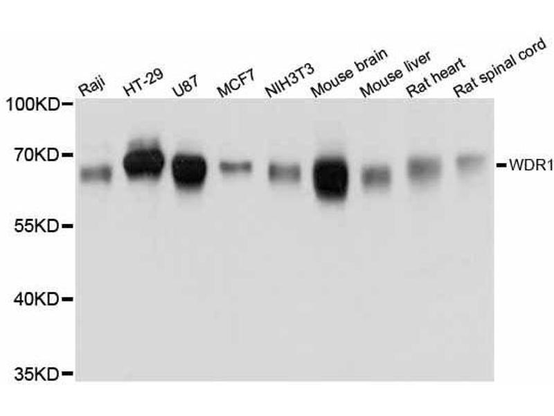 This gene encodes a protein containing 9 WD repeats. WD repeats are approximately 30- to 40-amino acid domains containing several conserved residues, mostly including a trp-asp at the C-terminal end. WD domains are involved in protein-protein interactions. The encoded protein may help induce the disassembly of actin filaments. Two transcript variants encoding different isoforms have been found for this gene.,WDR1,AIP1,HEL-S-52,NORI-1,Signal Transduction,Cell Biology & Developmental Biology,Cytoskeleton,Microfilaments,WDR1