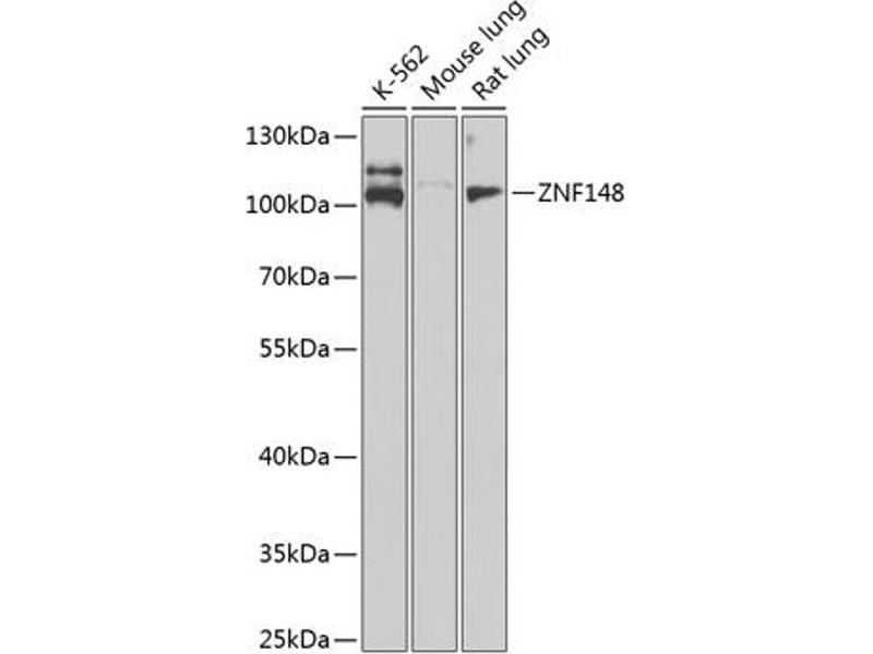 The protein encoded by this gene is a member of the Kruppel family of zinc finger DNA binding proteins. The encoded protein activates transcription of the T-cell receptor and intestinal alkaline phosphatase genes but represses transcription of the ornithine decarboxylase, vimentin, gastrin, stomelysin, and enolase genes. Increased expression of this gene results in decreased patient survival rates from colorectal cancer, while mutations in this gene have been associated with global developmental delay, hypoplastic corpus callosum, and dysmorphic facies.,ZNF148,BERF-1,BFCOL1,GDACCF,HT-BETA,ZBP-89,ZFP148, pH Z-52,Epigenetics & Nuclear Signaling,Transcription Factors,ZNF148