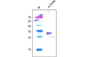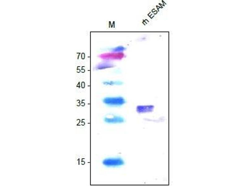 Endothelial cellselective adhesion molecule (ESAM) is a 55 kDa type I transmembrane glycoprotein that belongs to the JAM family of immunoglobulin superfamily molecules. Human ESAM is synthesized as a 390 amino acid (aa) protein composed of a 29 aa signal peptide, a 216 aa extracellular region, a putative 26 aa transmembrane segment, and a 119 aa cytoplasmic domain. The extracellular region contains one V-type and one C2-type Ig domain and is involved in hemophilic adhesion. In the cytoplasmic domain, there is a docking site for the multifunctional adaptor protein MAGI1. The extracellular region of human ESAM shows 90 % , 74 %, 69 % and 67 % aa identity with monkey, canine, mouse and rat extracellular ESAM, respectively. ESAM is expressed on endothelial cells, activated platelets and megakaryocytes, and can be found associated with cell to cell junctions. Whether ESAM is restricted to a particular junctional type is not clear. ESAM deficient mice have no defect in vascularization but do have reduced angiogenic potential. This may be due to a decreased migratory response to FGF2. Soluble ESAM is fused to a C-terminal His-tag (6x His).Synonyms: Endothelial cell-selective adhesion molecule