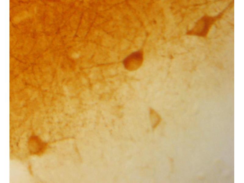 The 5-HT 5A Receptor Antibody was raised against synthetic peptide sequence corresponding to amino acids 17-34 of the rat 5-HT5A receptor coupled to carrier protein with glutaraldehyde. The 5-HT5A Receptor was quality control tested using standard immunohisto-chemical methods. The antiserum demonstrates strongly positive labeling of rat cortex and hippocampus using indirect immunofluorescent and biotin/avidin-HRP techniques. Recommended primary dilutions are 1/100 - 1/300 in PBS/0.3 % Triton X-100 - Cy3 and 1/200 - 1/400 in PBS/0.3 % Triton X-100 - Bn/Av-HRP. Intensification methods such as nickel will approximately double the dilution factor as recommended. The antibody was characterized by immunoblotting and immunohistochemistry. Immunoblots of rat brain extracts revealed the presence of two bands at molecular weights of 41 and 47 kD. The lower weight band agrees with the calculated molecular weight based on amino acid sequence. The higher weight may represent glycosylated receptor protein. Immunohistochemical staining of rat brain correlates well with Northern blot analysis and in situ hybridization studies. Immunolabeling is completely abolished by preadsorption with synthetic rat 5-HT5A receptor (17-34). BlastP database sequence homology searches indicate that the amino acid sequence is unique to rat and mouse 5-HT5A receptor.