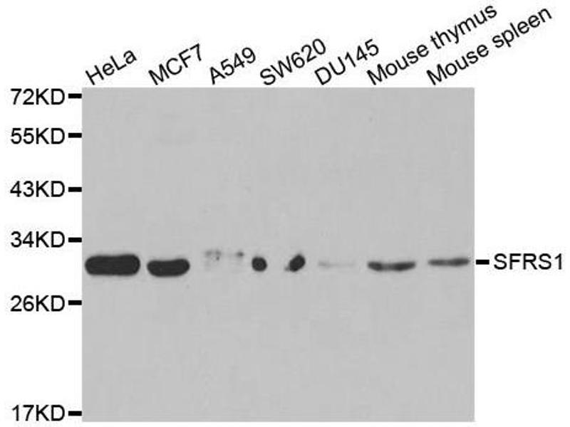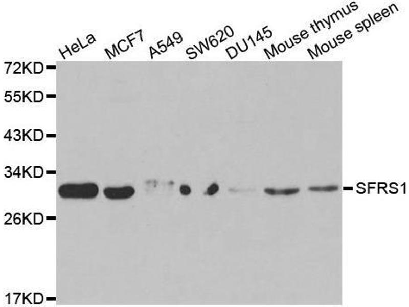 SF2/ASF is a member of the Ser-Arg-rich (SR) protein family of highly conserved nuclear phosphoproteins involved in pre-mRNA splicing. Besides its role in nuclear pre-mRNA splicing, SF2/ASF has been shown to shuttle between the nucleus and cytoplasm, suggesting additional roles in mRNA transport and cytoplasmic events. SF2/ASF associates with translating ribosomes and stimulates translation. It also activates translation initiation by suppressing the activity of 4E-BP1, which is mediated by SF2/ASF association with mTOR and the phosphatase PP2A. More recent studies have demonstrated a role for SF2/ASF in microRNA processing.