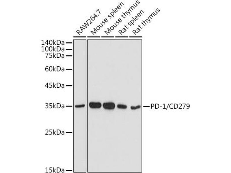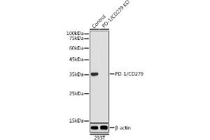 This gene encodes a cell surface membrane protein of the immunoglobulin superfamily. This protein is expressed in pro-B-cells and is thought to play a role in their differentiation. In mice, expression of this gene is induced in the thymus when anti-CD3 antibodies are injected and large numbers of thymocytes undergo apoptosis. Mice deficient for this gene bred on a BALB/c background developed dilated cardiomyopathy and died from congestive heart failure. These studies suggest that this gene product may also be important in T cell function and contribute to the prevention of autoimmune diseases.,PDCD1,CD279,PD-1,PD1,SLEB2,hPD-1,hPD-l,hSLE1,Cell Biology & Developmental Biology,Apoptosis,Immunology & Inflammation,CD markers,PD-1/CD279