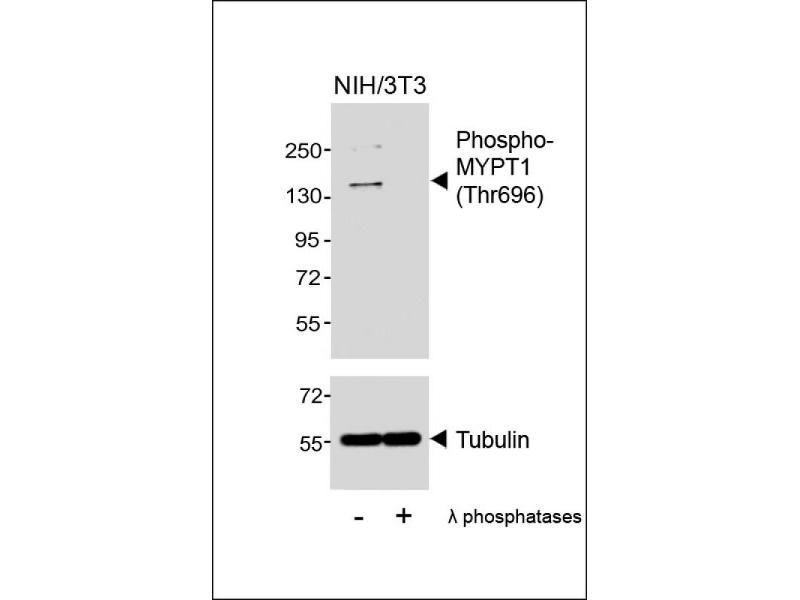 This Phospho-MYPT1 (Thr696) antibody is generated from a rabbit immunized with a KLH conjugated synthetic peptide between 669-702 amino acids from human MYPT1.