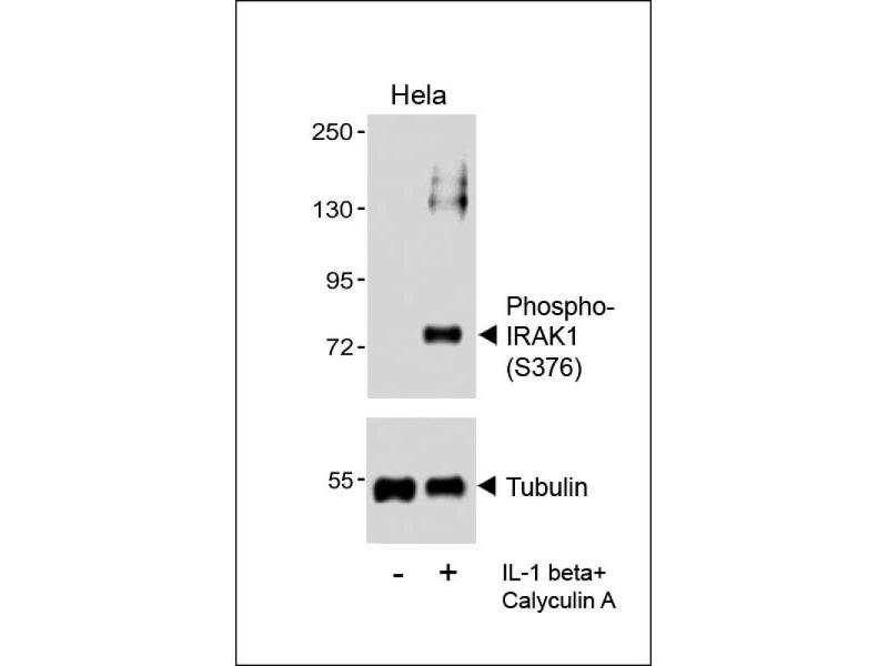 This Phospho-IRAK1(S376) antibody is generated from a rabbit immunized with a KLH conjugated synthetic peptide between 348-381 amino acids from human IRAK1.