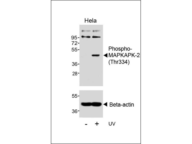 This Phospho-MAPKAPK-2 (Thr334) antibody is generated from a rabbit immunized with a KLH conjugated synthetic peptide between 308-341 amino acids from human Phospho-MAPKAPK-2.