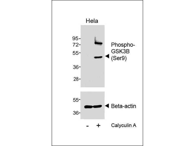 This Phospho-GSK3B (Ser9) antibody is generated from a rabbit immunized with a KLH conjugated synthetic peptide between 2-33 amino acids from human GSK3B.