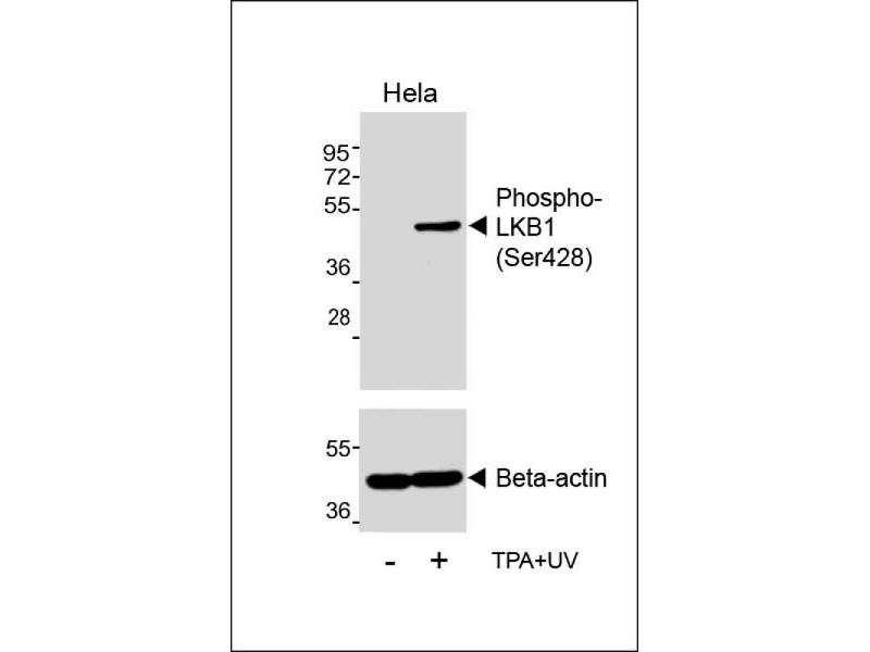 This Phospho-LKB1 (Ser428) antibody is generated from a rabbit immunized with a KLH conjugated synthetic peptide between 388-429 amino acids from the human LKB1 (Ser428).