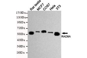 Component of the 9-1-1 cell-cycle checkpoint response complex that plays a major role in DNA repair. The 9-1-1 complex is recruited to DNA lesion upon damage by the RAD17-replication factor C (RFC) clamp loader complex. Acts then as a sliding clamp platform on DNA for several proteins involved in long-patch base excision repair (LP-BER). The 9-1-1 complex stimulates DNA polymerase beta (POLB) activity by increasing its affinity for the 3'-OH end of the primer-template and stabilizes POLB to those sites where LP-BER proceeds, endonuclease FEN1 cleavage activity on substrates with double, nick, or gap flaps of distinct sequences and lengths, and DNA ligase I (LIG1) on long-patch base excision repair substrates. The 9-1-1 complex is necessary for the recruitment of RHNO1 to sites of double-stranded breaks (DSB) occurring during the S phase. RAD9A possesses 3'->5' double stranded DNA exonuclease activity. Its phosphorylation by PRKCD may be required for the formation of the 9-1-1 complex.
