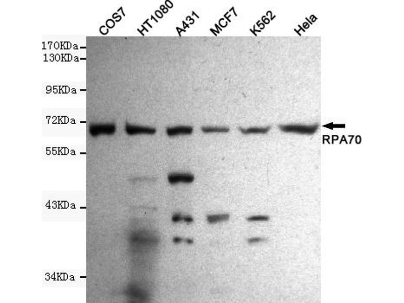 As part of the heterotrimeric replication protein A complex (RPA/RP-A), binds and stabilizes single-stranded DNA intermediates, that form during DNA replication or upon DNA stress. It prevents their reannealing and in parallel, recruits and activates different proteins and complexes involved in DNA metabolism. Thereby, it plays an essential role both in DNA replication and the cellular response to DNA damage (PubMed:< a href="http://www.uniprot.org/citations/9430682" target="_blank">9430682). In the cellular response to DNA damage, the RPA complex controls DNA repair and DNA damage checkpoint activation. Through recruitment of ATRIP activates the ATR kinase a master regulator of the DNA damage response (PubMed:< a href="http://www.uniprot.org/citations/24332808" target="_blank">24332808). It is required for the recruitment of the DNA double-strand break repair factors RAD51 and RAD52 to chromatin in response to DNA damage (PubMed:< a href="http://www.uniprot.org/citations/17765923" target="_blank">17765923). Also recruits to sites of DNA damage proteins like XPA and XPG that are involved in nucleotide excision repair and is required for this mechanism of DNA repair (PubMed:< a href="http://www.uniprot.org/citations/7697716" target="_blank">7697716). Plays also a role in base excision repair (BER) probably through interaction with UNG (PubMed:< a href="http://www.uniprot.org/citations/9765279" target="_blank">9765279). Through RFWD3 may activate CHEK1 and play a role in replication checkpoint control. Also recruits SMARCAL1/HARP, which is involved in replication fork restart, to sites of DNA damage. May also play a role in telomere maintenance (PubMed:< a href="http://www.uniprot.org/citations/17959650" target="_blank">17959650). As part of the alternative replication protein A complex, aRPA, binds single-stranded DNA and probably plays a role in DNA repair. Compared to the RPA2- containing, canonical RPA complex, may not support chromosomal DNA replication and cell cycle progression through S-phase. The aRPA may not promote efficient priming by DNA polymerase alpha but could support DNA synthesis by polymerase delta in presence of PCNA and replication factor C (RFC), the dual incision/excision reaction of nucleotide excision repair and RAD51-dependent strand exchange (PubMed:< a href="http://www.uniprot.org/citations/19996105" target="_blank">19996105).