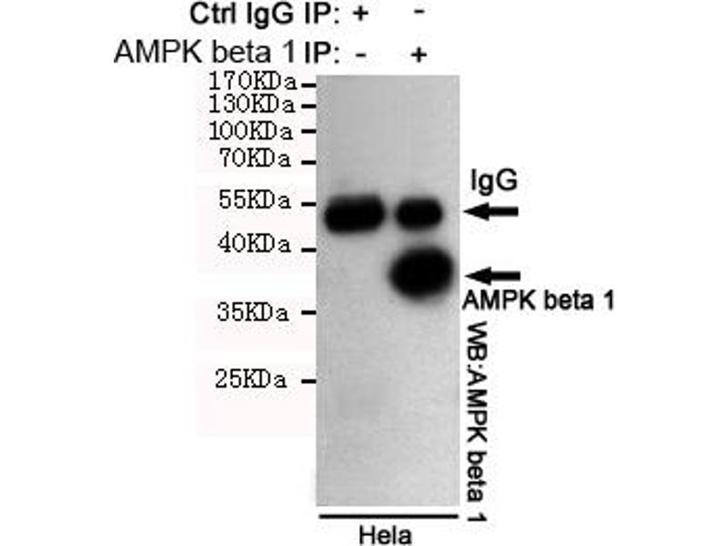 Non-catalytic subunit of AMP-activated protein kinase (AMPK), an energy sensor protein kinase that plays a key role in regulating cellular energy metabolism. In response to reduction of intracellular ATP levels, AMPK activates energy-producing pathways and inhibits energy-consuming processes: inhibits protein, carbohydrate and lipid biosynthesis, as well as cell growth and proliferation. AMPK acts via direct phosphorylation of metabolic enzymes, and by longer-term effects via phosphorylation of transcription regulators. Also acts as a regulator of cellular polarity by remodeling the actin cytoskeleton, probably by indirectly activating myosin. Beta non-catalytic subunit acts as a scaffold on which the AMPK complex assembles, via its C-terminus that bridges alpha (PRKAA1 or PRKAA2) and gamma subunits (PRKAG1, PRKAG2 or PRKAG3).