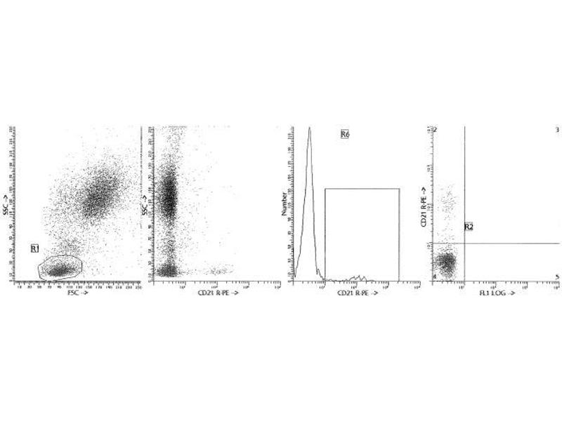 Antigen distribution: The CD21 antigen is expressed on mature B cells, follicular dendritic cells and pharyngeal and cervical epithelial cells [1,2]. CD21, also known as the Complement receptor type 2 (CR2) or Epstein-Barr virus (EBV) receptor, is a receptor for the C3 activation fragments iC3b and C3d. CD21 antibodies have been shown to bind CD23 and IFN-a. CD21 is part of a multimeric complex on B cells which includes CD19 and CD81 [3]. B-ly4 was clustered at the Leucocyte Typing Workshop IV [5].Cellular Expression: Mature B cells, follicular dendritic cells