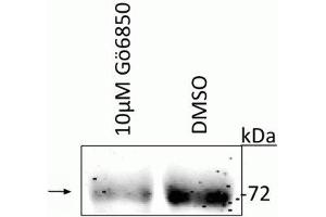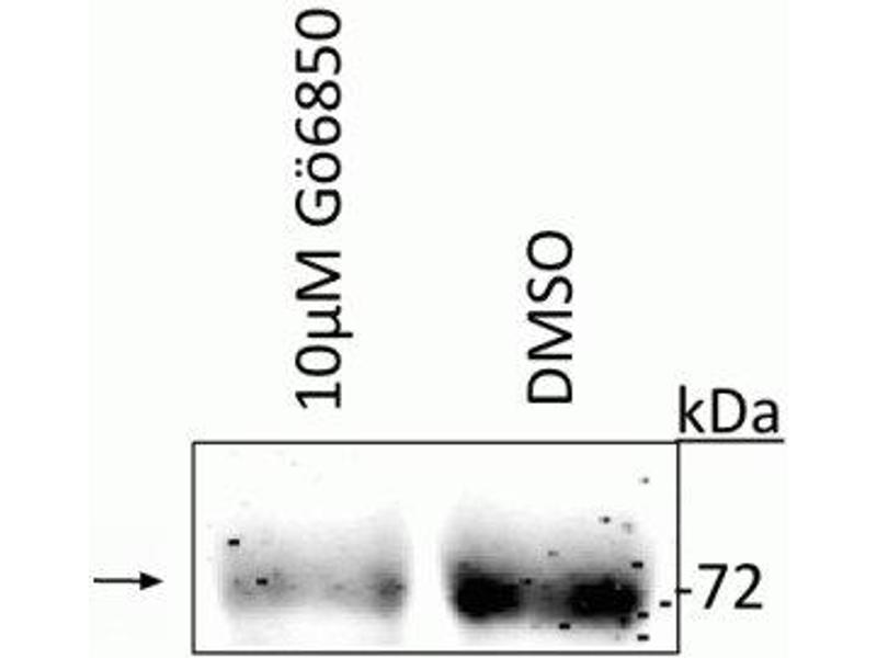 - Specific for endogenous levels of the ~72 kDa ATF2 protein phosphorylated at Thr52. Immunolabeling of the ATF2 band is reduced by treatment of the cells with the PKC catalytic inhibitor Gö6850.