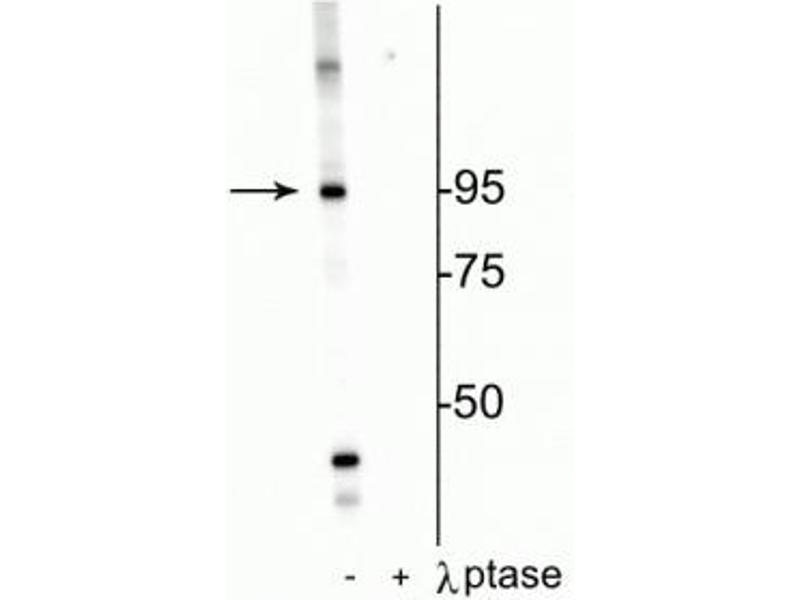 Specific for endogenous levels of the ~95 kDa Insulin receptor phosphorylated at Thr1160. Immunolabeling is completely eliminated with λ-phosphatase treatment.