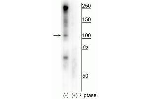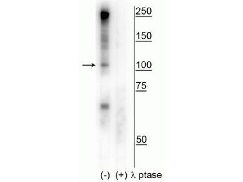 - Specific for endogenous levels of the ~100 kDa CtIP protein phosphorylated at Ser327. Immunolabeling is completely eliminated by treatment with λ-phosphatase.